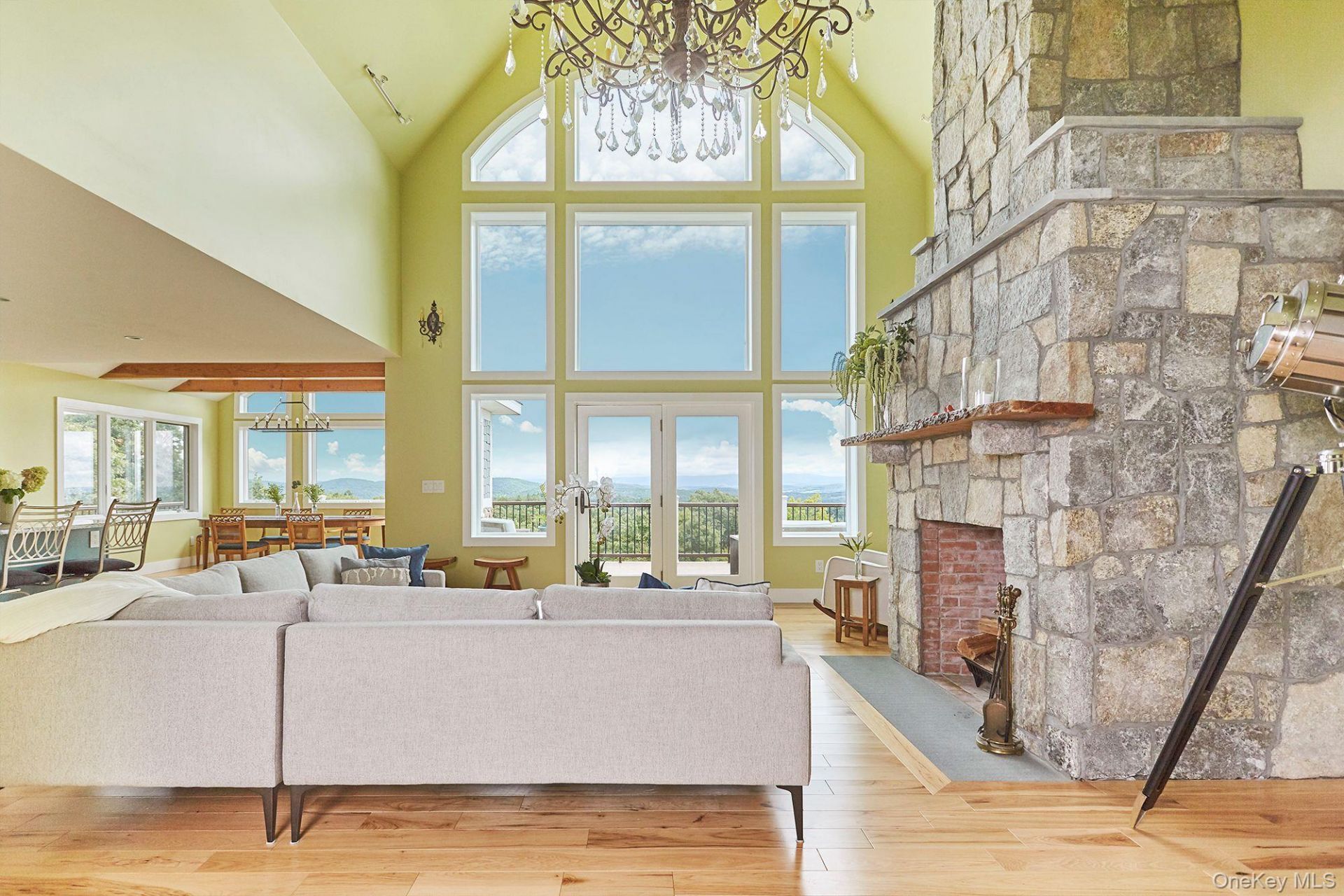 This custom-built house is located on a private road in Milan and offers sweeping views of the Berkshires and Stissing Mountain. The main level consists of a spacious open floor plan and features a living area with double-height ceilings, a stone two-story fireplace, beautiful kitchen & several dining areas. Ample windows and an expansive deck offer panoramic views from all three areas. The primary bedroom with ensuite bathroom, a powder room, and laundry room complete the first floor. On the second floor, there are two bedrooms and a full bathroom. The fully finished basement, perfect for guests or as an in-law suite, boasts high ceilings, poured concrete floors with radiant heat, two rooms that can be used as bedrooms and are equipped with beds, a full bath, an efficiency kitchen, and a family room that opens to a bluestone patio. There is a beautiful in-ground, heated pool, plus an outbuilding which adds approximately 800 sf of finished space on two levels, with a second floor deck, and a detached 2-car garage. The home sits on three private, landscaped acres.